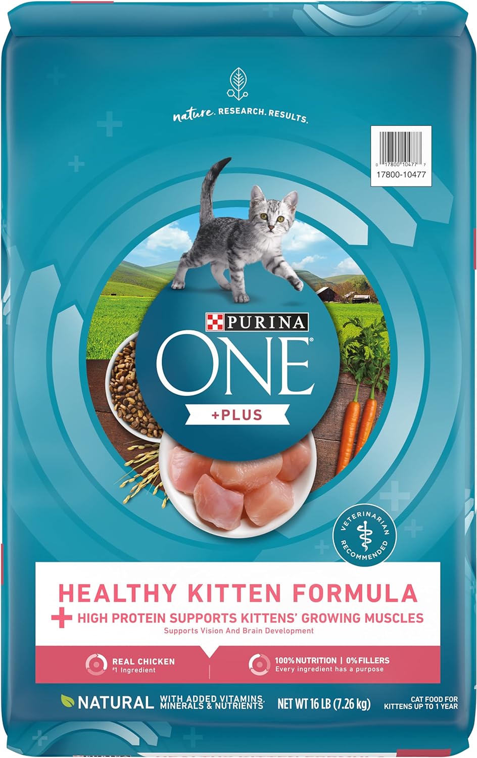 Give your growing kitten the nutrition she needs and a taste she loves when you serve Purina ONE Healthy Kitten Formula premium dry cat food. Real chicken as the first ingredient means you're serving your budding feline the delectable taste she loves while providing her with the high quality protein that helps her grow. This mouthwatering recipe is made with DHA, a nutrient found in mother's milk, which assists with brain and vision development. Your little friend is sure to love the enticing texture of the crunchy kibble, and you can feel good about giving her 100 percent complete and balanced nutrition to help support her overall health and wellness at every mealtime.