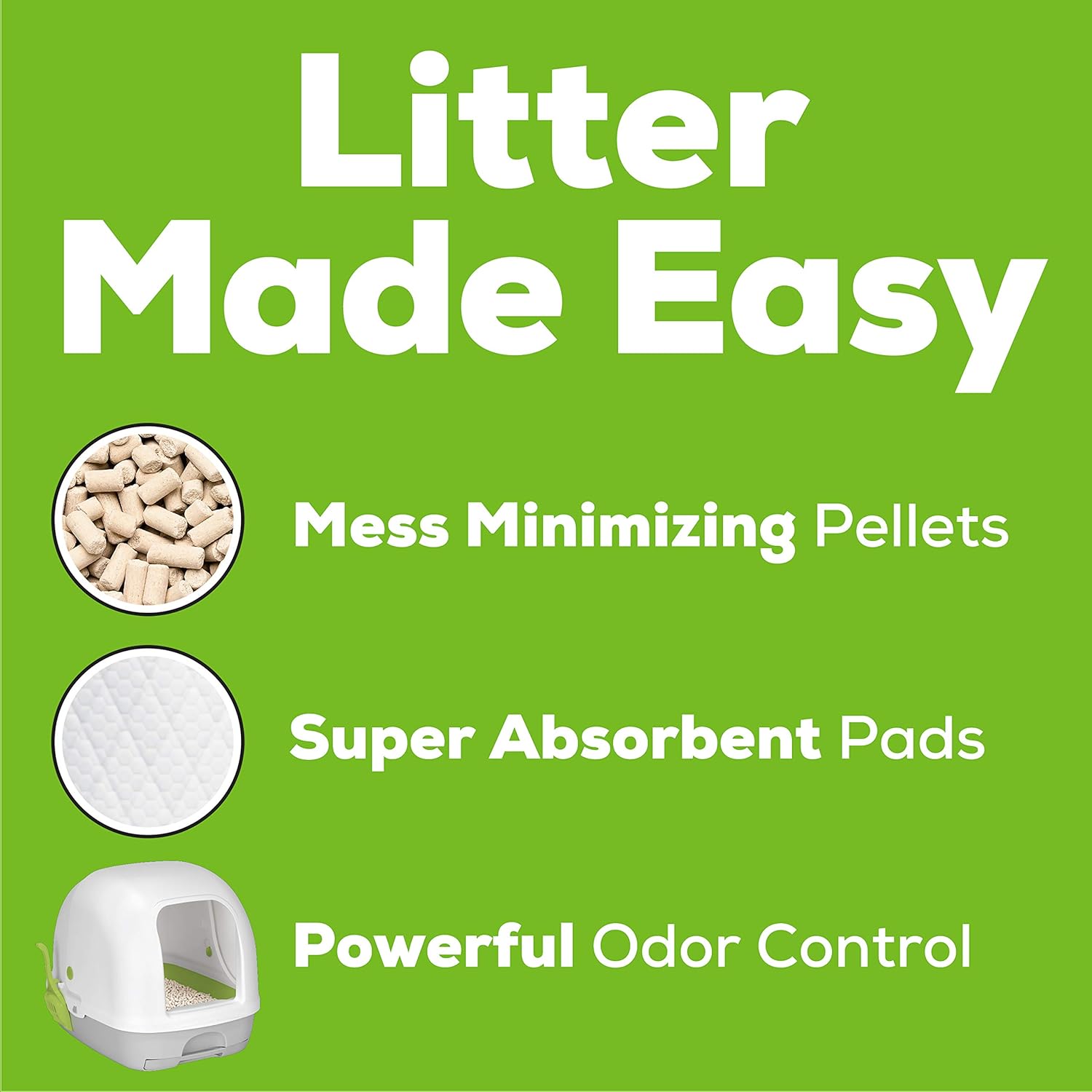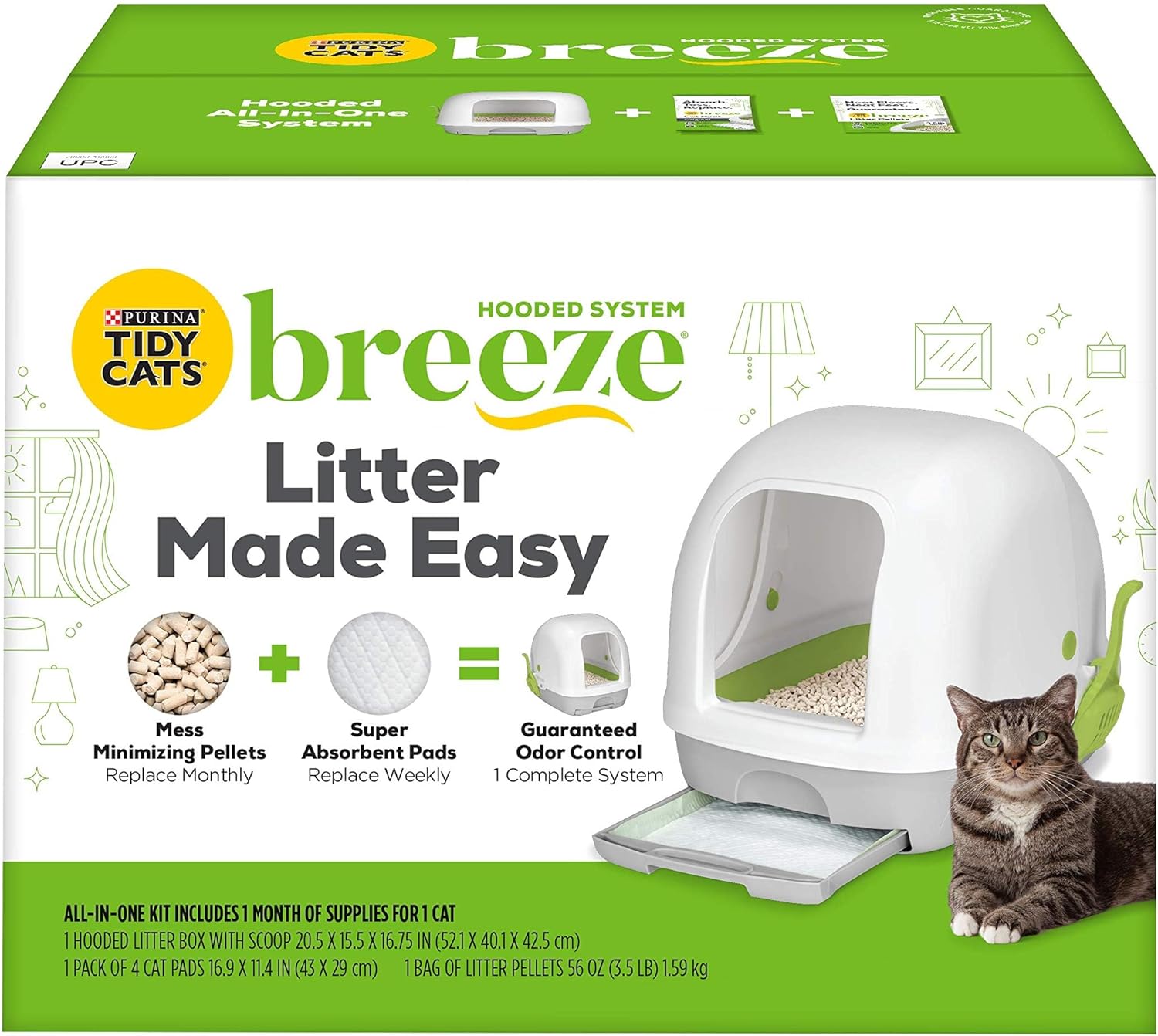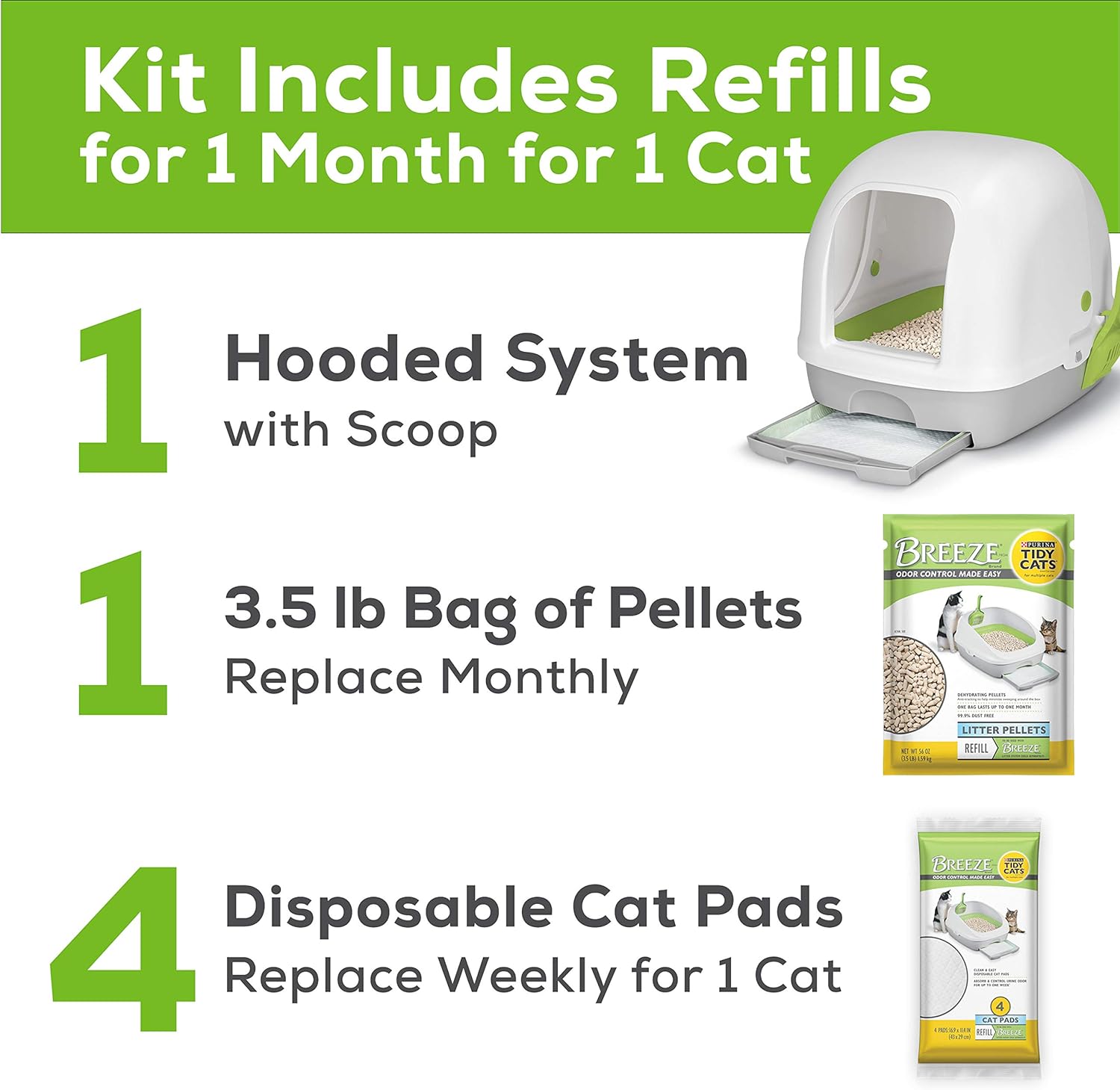 Give your cat a private place to do her business with outstanding kitty litter odor control when you use a Purina Tidy Cats Breeze hooded cat litter box system. Our innovative system makes it easy to check kitty litter care off your to-do list. Dehydrating, mess-minimizing pellets wick away moisture from solid waste and separate urine for quick and easy cleanup. The specialized kitty litter pellets are 99.9 percent dust free and minimize tracking. Neat Floors. Neat Feet. Satisfaction Guaranteed. To help keep her comfortable, our disposable, super-absorbent cat pads absorb urine, so the covered cat litter box remains dry, and they're guaranteed to prevent ammonia odor for seven days for one cat. A convenient hood keeps your cat discreetly hidden from sight as she uses her cat litter box.